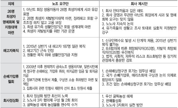 1차 교섭 이후 노조는 ▴26명 희생자 명예회복 및 지원대책 마련 ▴해고자 복직 ▴손해배상가압류 철회 ▴회사정상화 등의 4대 의제에 대한 요구안을 사측에 제출했다.