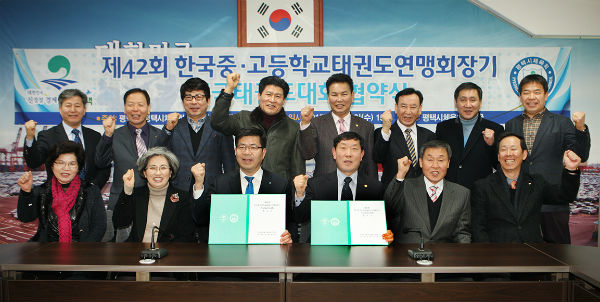 평택시(시장 공재광)는 평택시체육회 회의실에서 이철주 한국중․고등학교 태권도연맹회장, 박종식 상임부회장 등 태권도연맹 관계자들과 공재광 시장, 이해영 생활체육회장, 박주상 평택교육지원청 교육장 등 시 체육관계자 30여명이 참석한 가운데 ‘제42회 한국중․고등학교 태권도연맹회장기 전국태권도대회’의 성공적인 개최를 위해 11일 한국중․고등학교 태권도연맹(회장 이철주)과 업무 협약식을 열었다.
