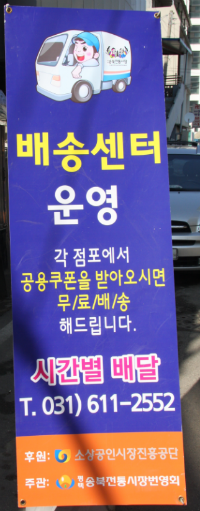 두 번째는 배송 시스템이다. 전통시장에서도 배달이 가능했다. “만원어치든, 십 만원어치든 상관없이 고객이 원하면 무료로 배송을 해주고 있어요. 상인들이 혼자 장사하는 사람들이 많아서 이렇게 배송차를 만들어 배달해주죠. 근데 홍보가 잘 안 되서 많이들 이용을 못하세요. 많이 이용하셔도 괜찮아요!” 또한 몸이 불편한 분들을 위해서는 대신 장을 보고 배송까지 해준다고 한다. “몸이 불편하신 분들은 상인회에 전화해서 삼겹살 1근, 쌀 1포대 등 원하는 것을 말하면 직접 장을 봐서 가져다 드리죠. 그리고 쿠폰도 있으니까 잘 활용하세요. 쿠폰은 한 장에 100원으로 알차게 사용하셨으면 좋겠어요!”