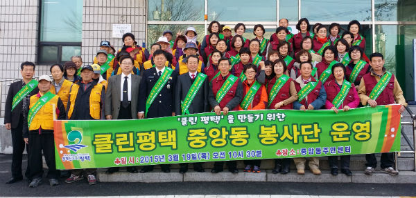 중앙동 통장·어른·클린코디를 포함한 77명의 환경지킴이들로 구성된 ‘클린평택 중앙동봉사단’은 19일 중앙동 주민 센터에서 발대식을 가졌다. 이날 발대식에서는 쓰레기배출 3대 원칙(규격봉투 사용, 낮·토요일 배출금지, 재활용분리배출) 지키기 홍보와 무단투기 등을 집중 감시하고, ‘내 집·상가 앞 쓰레기는 자발적으로 청소하기 운동’에 솔선수범하는 시민이 될 것을 다짐했다.