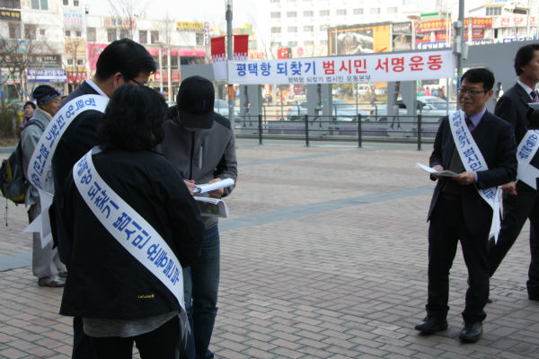 평택항 되찾기 범시민 운동본부(상임공동대표 김찬규, 이하 운동본부)는 평택항 서부두 신규매립지의 관할구역 결정을 앞두고 지난달 25일부터 평택역과 각 읍면동별로 범시민 서명운동을 실시하여 4월 2일까지 평택시 인구의 약 47%(21,2000명) 서명을 받았다.