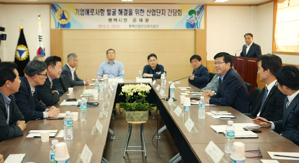 공재광 시장은 산업단지 입주기업의 경영환경 개선을 통해 일자리 창출 및 지역경제를 활성화시키고자 송탄·장당산업단지 입주기업인들과 애로사항 청취 해결을 위한 간담회를 가졌다. 지난 13일 평택산업단지관리공단 회의실에서 개최된 간담회는 (주)태진 조세규 대표이사(평택산업단지관리공단 이사장)를 비롯하여 기업인 20여명이 참석했다.