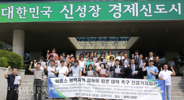 (사)평택시학원연합회, (사)평택시남부학원연합회, (사)평택시서부학원연합회, 평택시성시화운동본부, 평택샬롬나비 등 18개 단체는 12일 11시 평택시청 앞에서 ‘메르스 평택지역 피해에 따른 대책촉구 긴급 기자회견’을 가졌다. 이들은 메르스 사태로 평택시의 사회경제, 정신적, 물적 피해가 커짐에 따라 그에 따른 정부와 지자체의 대책을 촉구했다.