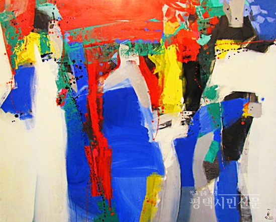 이계송 2008년작 /황·청·백·적·흑, 오방색으로 예술을 통한 삶의 여유를 표현한 이계송 화백은 본지 창간 19주년을 맞아 지방자치와 지역문화 활성화를 염원한다고 전했다.