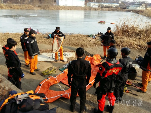 송탄소방서(서장 김철수)는 지난 11일 동천 저수지(진위면 소재)에서 구조대원 30명을 대상으로 겨울철 수난구조 훈련을 실시하였다고 밝혔다.