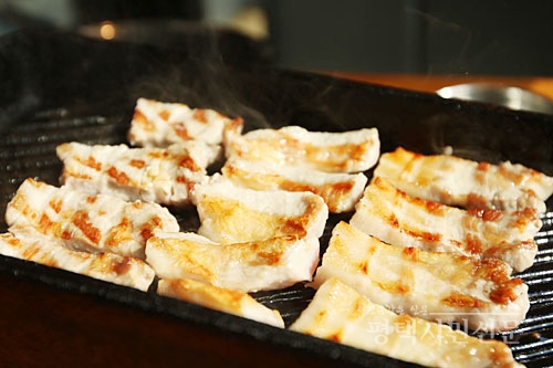 삼겹살 전문점인 만큼 이집의 인기메뉴는 ‘삼겹살’이다. 특히, 250℃ 무쇠불판에 다리미로 생긴 돌판을 눌러 직접 구워주는 것이 인상적이다. 높은 온도에서 빠르게 구워낸 삼겹살을 이집만의 특제마늘소스에 찍어 먹어보니 육즙이 그대로 살아있는 듯하다. 또 다른 인기메뉴인 노릇노릇하게 구워낸 항정살을 짭짤한 상추 샐러드와 곁들이니 고소한 항정살의 풍미가 깊게 느껴진다.