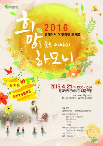 평택북부장애인복지관(관장 유영애)은 이달 21일 장애인의 날을 맞아 평택남부문예회관에서 제3회 함께여서 더 행복한 콘서트 ‘희망을 품은 이야기 HARMONY’를 진행한다.