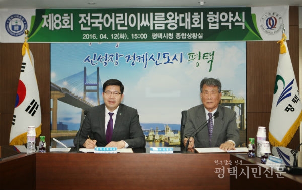 평택시는 지난 12일 평택시청 종합상황실에서 공재광 평택시장, 박두진 통합씨름협회장을 비롯해 여러 관계자가 참석한 가운데 제8회 전국어린이씨름왕대회 협약식을 가졌다.