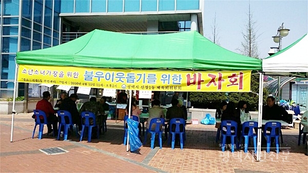 신장1동 체육회(회장 송두학)는 지난 15일 신장1동 주민센터 앞에서 지역 내 소년소녀가장을 돕기 위한 바자회를 열었다.