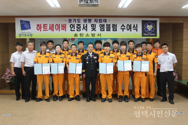 송탄소방서(서장 김철수)는 지난 18일 송탄소방서 2층 대회의실에서 구급활동 중 심장정지 환자를 소생시킨 소방공무원 10명에 대한 ‘하트세이버 인증서 및 엠블럼 수여식’을 가졌다.