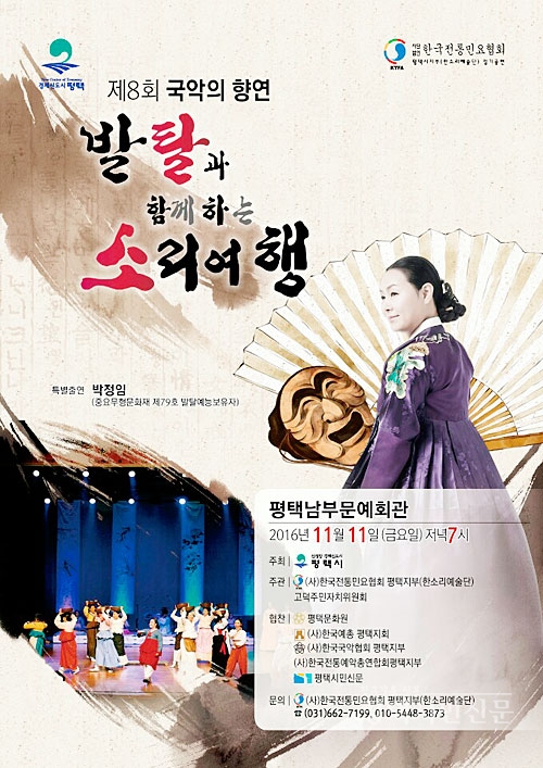 전통가락의 흥겨움을 느낄 수 있는 (사)한국전통민요협회 평택지부(한소리예술단)의 제8회 국악의 향연 ‘발탈과 함께하는 소리여행’이 오는 11일 저녁 7시 남부문예회관에서 펼쳐진다.