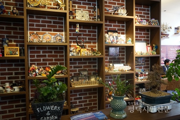 서정리역 1번 출구로 나와 장당초등학교 방면으로 걷다보면 따뜻한 커피 그림의 간판이 인상적인 카페 ‘커핑’이 나온다. 카페에 들어서자마자 가장 먼저 눈에 띄는 건 벽 한 쪽을 가득 채운 인테리어 소품이다. 해외여행을 다니면서 사 들인 각 나라의 기념품들은 카페에 앉아있는 것만으로도 이국적인 분위기를 느낄 수 있게 해준다.