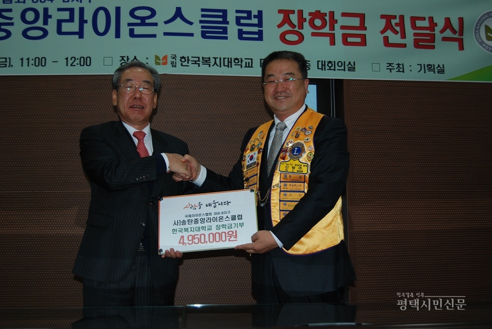 국제라이온스협회 354-B지구 송탄중앙라이온스클럽의 신형주 회장, 원철재 제 3부회장, 양재웅 재무, 김용일 회원, 김명숙 사무장은 18일 한국복지대학교(총장 이상진)를 방문하여 대학생들의 식생활 개선을 위해 해피밀(Happy Meal) 장학금 495만원과 김장김치 60포기를 기탁했다.