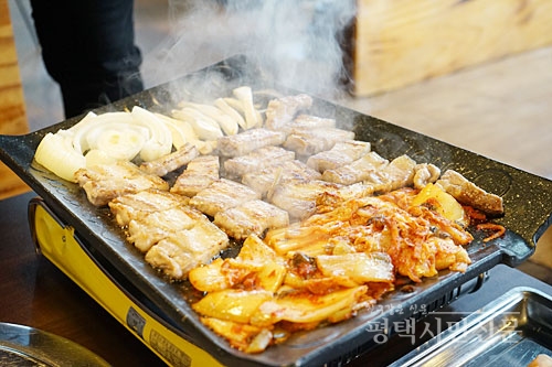 ■메뉴:△국내산 생삼겹살 (200g) 11,000원, △한우암소꽃등심 (180g) 20,000원, △돼지 한판떼기 (600g, 3인 분) 35,000원, △도누 한판떼기 (750g, 4인 분) 55,000원, △우리콩 청국장 7,000원