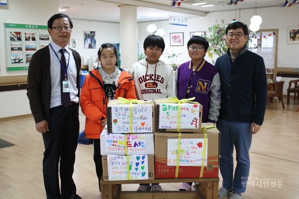 21일 평택시 청북읍에 위치한 삼덕초등학교(교장 김태훈)는 평택시노인전문요양원(원장 이강희)에 학생들이 직접 담근 김장김치와 떡을 전달하는 시간을 가졌다.