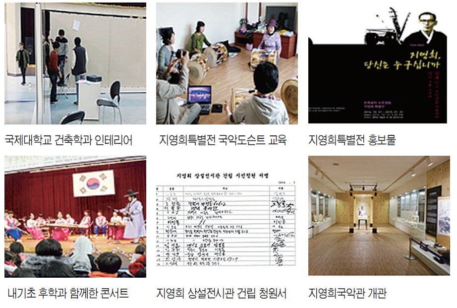 수많은 업적에도 불구하고 실지 지영희에 대한 자료는 거의 찾아보기 어렵다. 그의 업적을 훔쳐간 사람들 때문이다. 어린 시절 아버지의 열정과 억울한 삶을 모두 보고 자란 유족들도 또한 상처가 깊었다. 하지만 평택시의 지영희 위인에 대한 순수한 연구 목적과 자세에 얼어 있는 마음을 열 수 있었다. 아무에게도 공개하지 않은 지영희 유물들을 평택시에 기증하였다. 또한 국악음반박물관 노재명 관장도 평생 힘들게 모은 많은 유물들을 지영희의 위대함을 조명할 수 있도록 무상 기증하였다. 그렇게 수집한 유물 400여 점과 그의 비운의 스토리가 2014년 지영희특별전을 통해 세상에 최초 공개되었다. 평택 국제대학교 건축과 학생들이 힘을 모았으며 지영희 후학인 내기초등학교 지영희국악관현악단 학생들이 지영희 음악을 연주하며 함께 했다. 그렇게 지영희특별전은 성황리에 잘 끝났다. 동아일보와 한겨레신문 뿐만 아니라 YTN, 아리랑TV에서도 평택시의 전통음악사업을 주목하며 다큐와 뉴스로 제작해 언론에 공개 했다. 그렇게 지영희특별전을 접한 평택 시민들이 지영희의 인생에 감동했다. 시민들은 지영희 상설 전시관을 만들어야 한다고 아우성 쳤다. 평택시 문화관광해설사 네 분이(김연숙, 노명희, 이경희, 이용중) 힘을 모아 시민청원서를 받았고 마침내 2015년 8월 26일 평택호 한국소리터에 지영희국악관이 만들어졌다. 위대한 영혼은 사라지지 않는 것일까. 지영희국악관은 그야말로 자연발생적으로 만들어지게 된 것이다.