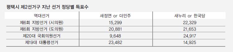 2014년 제6회 지방선거, 2016년 제20대 국회의원 선거, 2017년 제19대 대통령선거 투표 결과를 분석하면 평택2선거구가 속한 중앙동‧서정동‧송탄동‧통복동‧세교동 등은 보수적 투표성향을 유지했지만 최근 대통령선거에서는 진보적 투표성향을 보인바 있다.