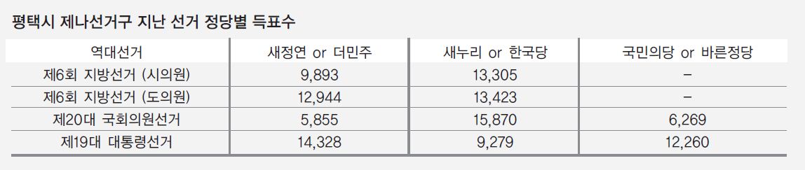 2016년 총선 당시에는 원유철 새누리당 후보가 중앙동과 서정동에서 총 1만5870표로 당시 고인정 더불어민주당 후보의 득표수 5855표와 최인규 국민의당 후보의 득표수 6269표를 크게 앞섰다.