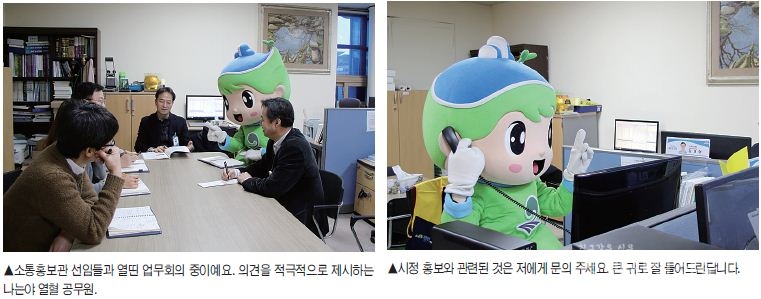 출근을 하면 소통홍보관 소셜미디어팀의 막내답게 활기찬 목소리로 인사를 해요. 같이 일하는 선배님들에게 재롱둥이인 제가 밝은 인사를 하면 소통홍보관실의 분위기가 확 살아나거든요. 업무 현장 분위기는 다 막내하기 나름 아니겠어요~ 찡긋!