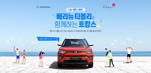 티볼리와 떠나는 호캉스 이벤트 모집일정은 ▲그랜드 앰배서더 서울 풀만(6월 10일~23일) ▲스카이베이 경포(6월 17일~30일) ▲켄트호텔 광안리 by 켄싱턴(6월 24일~7월 7일) ▲여수 헤이븐 호텔(7월 1일~14일)이며 오는 7월 14일(일)까지 쌍용자동차 홈페이지를 통해 신청하면 된다.