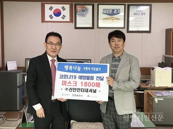 [평택시민신문] 포승읍에 위치한 ㈜신안인터내셔널(대표이사 주윤일)는 지난 9일 코로나19을 극복하고자 취약계층에게 써달라며 안중출장소을 방문해 마스크 1800개를 기탁했다.