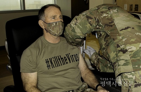 [평택시민신문] 29일 로버트 에이브람스 주한미군사령관이 평택 캠프험프리스 내 브라이언 D. 올굿 육군병원에서 모더나 코로나19 백신을 맞고 있다.