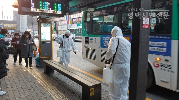 [평택시민신문] 평택시재향군인회는 16일 시민이 자주 이용하는 평택역, 평택 터미널, 버스승강장, 상가 등에서 집중 방역을 전개했다.