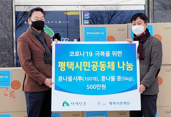 [평택시민신문] 평택신문이 코로나19로 어려움을 겪는 이들에게 전해 달라며 콩나물 시루(100개)와 콩나물 콩 5kg(70만원 상당) 그리고 기부금 500만원을 평택시민재단에 11일 전달했다.