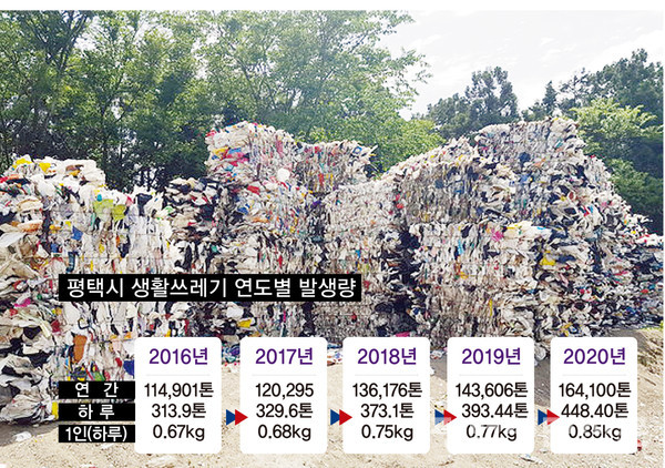 1월 19일 평택시에 따르면 2020년 한 해동안 처리한 생활폐기물은 15만249톤으로 하루 발생량은 411톤이나 된다. 이는 지난 2019년 14만3606톤보다 14.2%(6643톤)이 늘어난 것으로 2018~2019년 5.45%보다 두 배가 넘는 수치다.