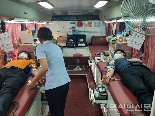 송탄소방서 직원들이 1월 19일 청사 앞에 주차된 대한적십자사 경기혈액원 차량에서 헌혈을 하고 있다. 이날 송탄소방서는 코로나19로 혈액보유량이 감소함에 따라 소방공무원, 사회복무요원 등 28명이 자발적으로 헌혈에 동참했다.