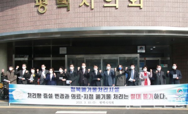 평택시의회는 3월 10일 시의회 앞에서 ‘청북 폐기물 처리시설 허가사항 변경 반대 성명서’를 발표했다. 홍선의 의장 등 시의원 16명은 “청북 폐기물 처리시설은 환경영향평가에 따라 하루 최대 80톤의 산업(일반)폐기물 처리가 허가됐다”며 “주민의 건강과 생활환경을 위해 산업폐기물 처리량 증설을 반대한다”고 강조했다. 이어 “의료폐기물 처리시설로의 변경과 관련 경기도와 한강유역환경청은 당초 협의한 사업계획대로 추진해달라”고 촉구했다.