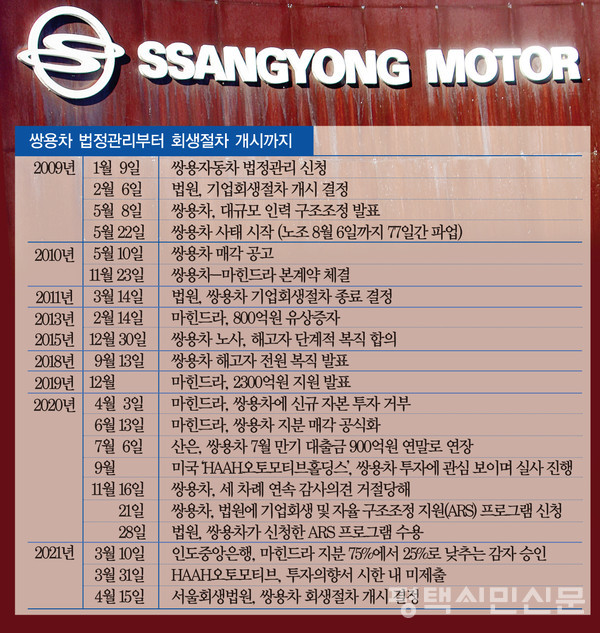 그동안 법원은 12월 21일 쌍용차가 기업회생과 함께 신청한 자율구조조정지원(ARS) 프로그램에 따라 두 차례에 걸쳐 회생 개시 결정을 미뤘지만 지난 3월 31일까지 우선협상대상자인 HAAH오토모티브가 투자의향서(LOI)조차 제출하지 못하면서 이 같이 결정했다. 회생 관리절차 관리인에는 매각 협상을 주도해 온 정용원 쌍용차 기획관리본부장(전무)이 선임됐다.
