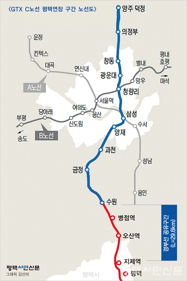 한편 GTX C노선은 수원~삼성동~청량리~양주 덕정 간 74.2km 구간을 잇는 광역철도로 올해 착공해 2024년 완공될 예정이다. 평택 연장은 GTX C노선과 경부선을 이용해 수원역~병점역(화성)~오산역~지제(평택) 29.8km를 연장 운행하는 방안이다.