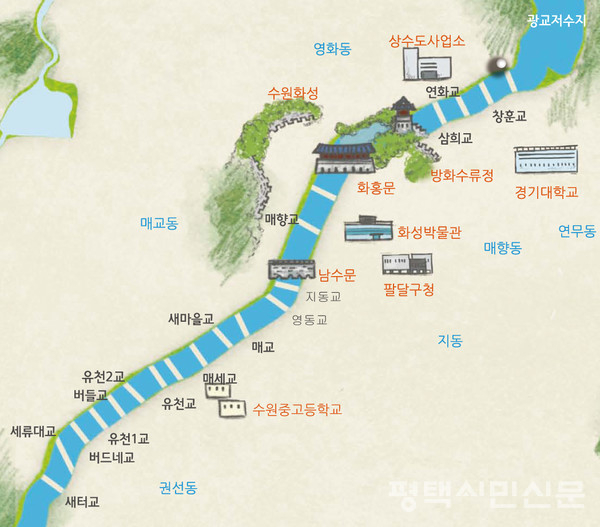 평택환경행동 회원들과 수원화성 화홍문과 수원천을 방문했다. 지방하천 수원천은 수원시 북쪽에 병풍처럼 펼쳐진 한남정맥의 백운산, 광교산에서 발원하여 광교저수지에 머물다 수원화성 북수문(화홍문), 남수문을 거쳐 수원시 남부와 화성시 북부 경계 지역인 대황교동에서 황구지천으로 흘러든다. 황구지천은 화성시를 남쪽으로 흘러 평택시 서탄면 황구지리 미군기지 주변에서 진위천에 합류하여 평택호로 향한다.