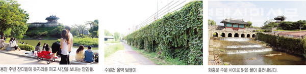 수원천 물은 수원시가 상수원보호구역으로 지정해 비상 식수원으로 활용하고 있는 광교저수지에서 흘러오는 물 덕분에 통복천보다는 수질이 양호하다. 화홍문 동쪽 언덕에 자리잡은 동북각루(방화수류정)에 올라 탁트인 사방을 둘러보면 시원한 바람에 코로나19로 인한 우울감을 모두 날려 버릴 수 있다. 서쪽으로는 팔달산 위에 서장대가 보인다. 수원천은 수원시의 북쪽에서 남쪽으로 흐르는데 하천 위로 성곽이 연결되는 부분에 수문을 설치하여 북쪽에는 북수문(화홍문), 남쪽에는 남수문을 설치했다. 북수문에는 7개의 무지개 모양 수문이 설치되어 물이 흘러내려 가도록 했다.