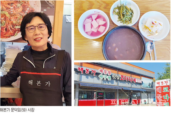 한편 해본가에는 해물요리 음식점에서 찾아보기 어려운 독특한 메뉴가 하나 있다. 바로 팥죽이다. 문덕임 사장 개인적으로 팥죽을 좋아해서 집에서 해 먹듯 쑤어 메뉴에 올렸는데 반응이 좋아 이제는 팥죽을 먹으러 오는 단골들이 많다고 한다. 코다리나 해물요리 맛이 기본적으로 맵고 칼칼해 팥죽을 주문해 같이 먹는 사람들도 많다고 한다. 특히 이곳 팥죽은 찹쌀 새알심을 제외하고는 완전히 팥만을 갈아 사용한다. 찹쌀가루를 사용하지 않기 때문에 텁텁하지 않고 깔끔한 맛을 자랑한다.