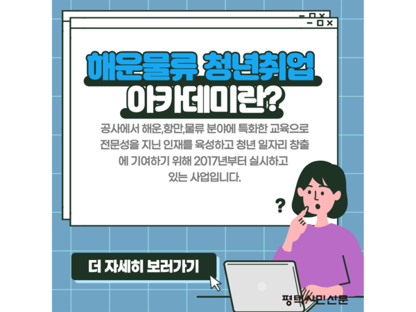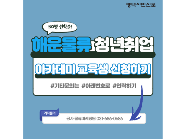 관련기사 평택항만공사 해운물류 청년취업 아카데미 교육생 모집 유수현 기자 webmaster@pttimes.com 다른기사 보기 저작권자 © 평택시민신문 무단전재 및 재배포 금지 당신만 안 본 뉴스 한화이글스 간 라온고 하동준 “벅찬 기쁨과 책임감 느껴” 국힘 조강특위, 평택을 등 ‘사고당협’ 지원자 면접 [기획] 녹조와 심각한 수질 오염에 신음하는 평택호에 바닷물을… 21일 ‘일상 속의 예술, 예술 속의 일상’ 전시 개막 오색으로 물든 정원에서 느끼는 가을 정취 김현정, 굽네치킨 ‘정무수석 외압’ 의혹 제기 “중국 서해 구조물 문제를 혐중으로 왜곡 안 돼” 한화이글스 간 라온고 하동준 “벅찬 기쁨과 책임감 느껴” 댓글삭제 삭제한 댓글은 다시 복구할 수 없습니다. 그래도 삭제하시겠습니까? 비밀번호 닫기 기사 댓글 0 댓글 접기 댓글 내용입력 비회원 로그인 이름 비밀번호 댓글 내용입력 댓글쓰기 계정을 선택하시면 로그인·계정인증을 통해 댓글을 남기실 수 있습니다. 회원 로그인 비회원 글쓰기 이름 비밀번호 자동등록방지 로그인 옵션 창닫기 주요기사 예산 고갈로 산모신생아 건강관리 차질 우려 쿠팡 택배노동자 사망…평택지청에 특별감독 촉구 평택지역 도의원들 도의회 행감에서 활약 13년간 5만7400장, 한광중이 나른 ‘따뜻한 겨울’ 고덕10유치원·고덕1중학교 신설 평택항만공사, 95kW 규모 ‘햇빛발전소’ 조성