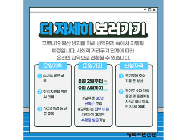 주요기사 예산 고갈로 산모신생아 건강관리 차질 우려 쿠팡 택배노동자 사망…평택지청에 특별감독 촉구 평택지역 도의원들 도의회 행감에서 활약 13년간 5만7400장, 한광중이 나른 ‘따뜻한 겨울’ 고덕10유치원·고덕1중학교 신설 평택항만공사, 95kW 규모 ‘햇빛발전소’ 조성