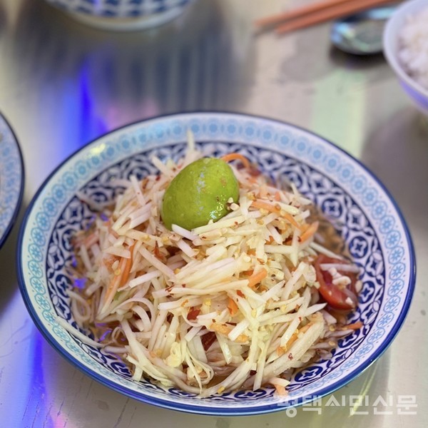솜땀은 유 대표 표현에 따르면 ‘정말 만들기 힘든 샐러드’다. 이유를 찾아보면 재료인 그린 파파야 때문이다. 그린 파파야는 억세기 때문에 절구와 공이를 사용해 잘 으깨 식감을 살려줘야 한다. 새콤하면서 매콤하고 짭짤하기도 한 복잡하고 섬세한 소스도 매력적이다.