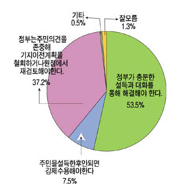 이는 중앙정부의 기지이전 과정이 순탄치 않을 것임을 예고하는 대목이다. 한편, ‘주민을 설득한 후 안되면 강제수용해야 한다’는 의견은 7.5%에 그쳐 대다수 시민은 강제수용을 반대하는 것으로 나타났다.