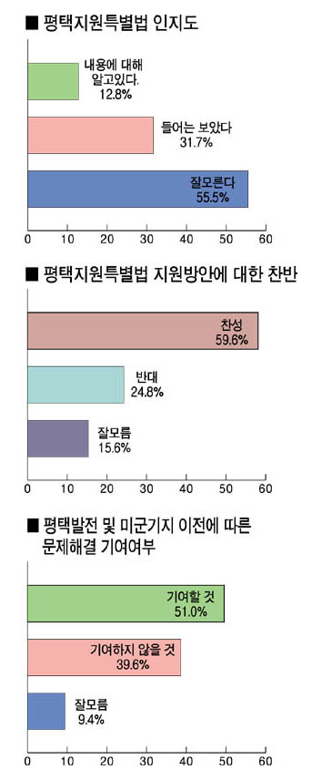평택시민의 51.0%는 미군기지 평택이전에 따른 평택지원 특별법 제정이 평택발전 및 미군기지 이전에 따라 발생하는 문제해결에 기여할 것이락 보고 있다(매우기여할 것 6.8%, 다소기여할 것 44.2%). 그러나 기여하지 못할 것이라는 의견도 39.6%에 달해 특별법이 예상되는 문제 해결에 별 도움이 되지 않을 것이라는 주민도 상당수 있는 것으로 나타났다.