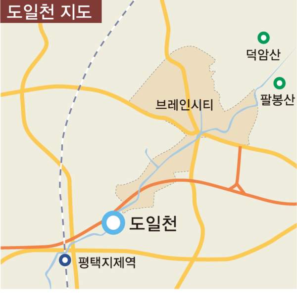 덕암산 남동쪽 골짜기에서 발원하는 도일천은 팔용산과 덕암산 사이 지방도로를 따라 남서쪽으로 흐르다 브레인시티산업단지 중심부를 관통한다. 팔용산으로 이어지는 능선은 평택시 도일동과 안성시 원곡면의 경계 지역이자 안성천 수계와 진위천 수계의 분수령이다. 덕암산 능선 북동쪽 원곡면으로 내린 빗물은 산하천을 통해 진위천으로 합류되고, 남동쪽 도일동으로 흘러내린 물은 도일천을 통해 안성천을 향해 달려간다. 도일천 상류 제방은 콘크리트 구간이 많고, 하천 폭이 좁아 물길을 찾아보기 어렵다.