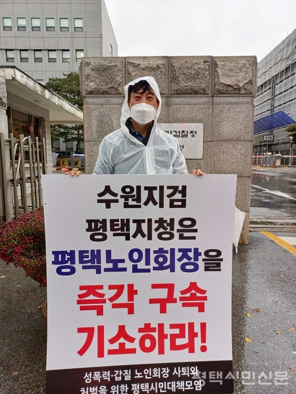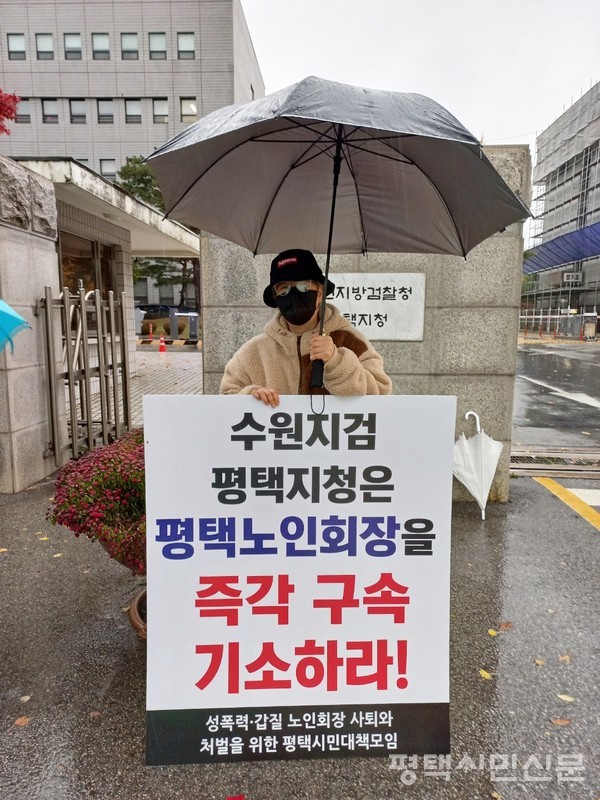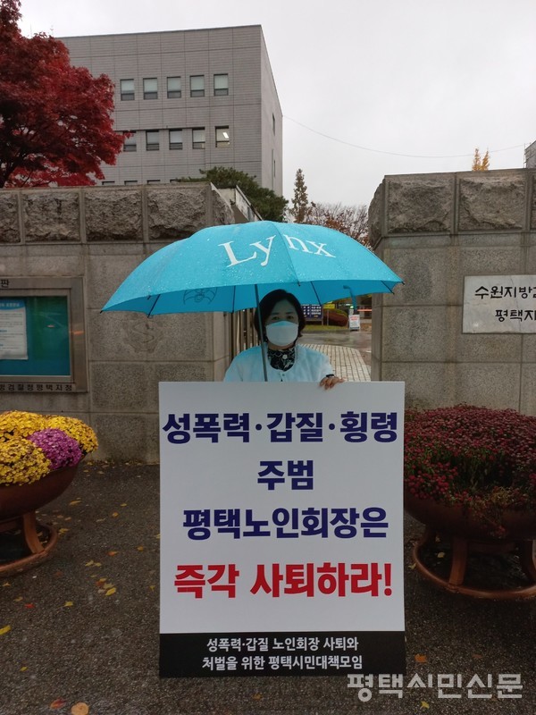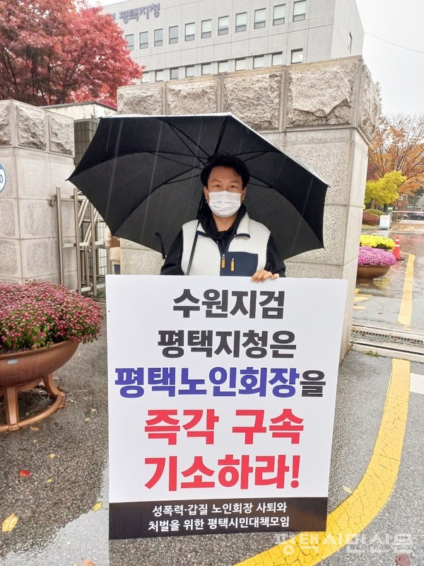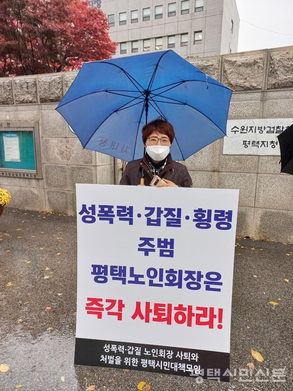 ‘성폭력 평택노인회장 사퇴촉구 평택시민대책모임’이 11월 8일 수원지검 평택지청 앞에서 평택시노인회장의 사퇴와 구속수사를 촉구하는 1인시위를 시작했다. 이날 오전 8시부터 이은우 평택시민재단 이사장, 고윤옥 평택시학원연합회장, 권은미 평택직장인밴드연합회 기획팀장, 정의당 김희아 씨, 민주당 이대경 씨(위로부터)가 참여했다. 대책회의는 1인시위를 이어가면서 17일에는 평택역에서 ‘노인회장 사퇴를 촉구하는 촛불산책’을 개최할 예정이다.