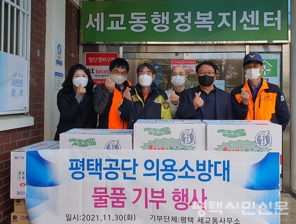 평택공단 의용소방대가 11월 30일 세교동행정복지센터를 방문해 햄 90세트와 김 70세트를 기탁했다.
