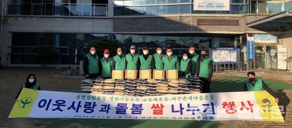 진위면 새마을지도자협의회는 12월 1일 ‘사랑의 쌀 및 손소독제 나눔 행사’를 열고 취약계층·홀몸노인 등 100가구에 햅쌀과 손소독제를 전달했다.