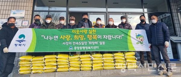 서정리 민속5일장 희망해는 연말을 맞아 12월 2일 중앙동행정복지센터에 어려운 이웃을 위한 사랑의 쌀 50포(10kg)를 전달했다.