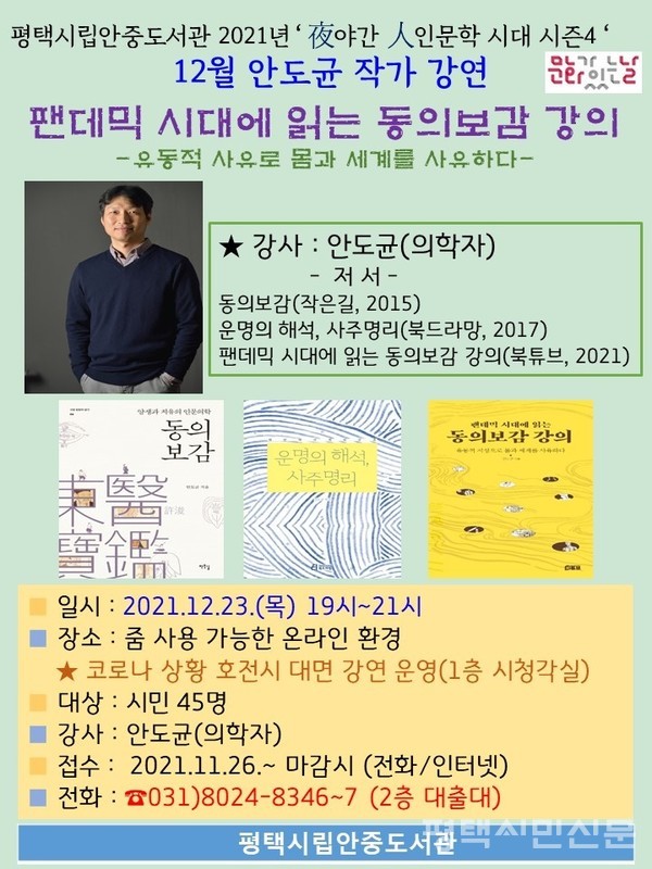 안도균 작가는 ‘도담’이라는 별칭으로 알려졌다. 전공은 수의학(서양의학)이지만 30년간 한의학을 독학하며 우리 몸에 대해 탐구해 왔다. <동의보감, 양생과 치유의 인문의학>, <운명의 해석, 사주명리> 등의 저서가 있다. 참가 신청은 전화나 도서관 홈페이지에서 가능하다. 031-8024-8346~7