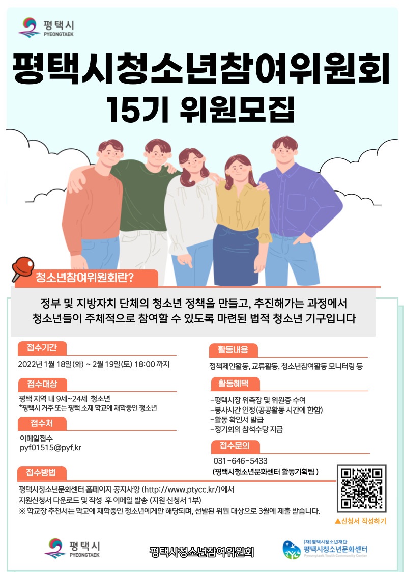 평택시 청소년문화센터는 오는 2월 19일까지 제15기 청소년참여위원회 위원을 모집한다.