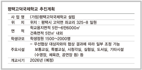 평택고덕국제학교는 고덕국제신도시 에듀타운 구역 5만~6만6000㎡ 부지에 건축전체면적 5만㎡ 규모로 설립될 예정이다. 2026년 개교를 목표로 하며 학생 정원은 1500~2000명 내외로 추진되고 있다.
