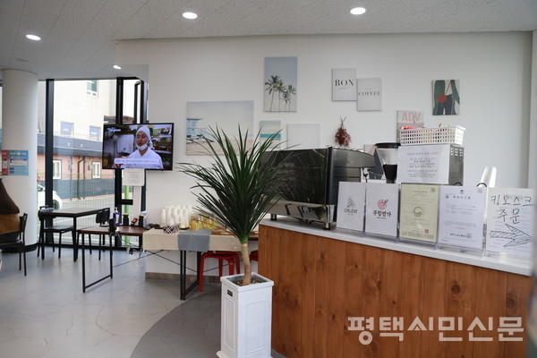 매장에 들어서면 한편에 콜라보를 이루는 작고 아담한 카페가 마련되어 있다. 식사를 마친 고객들이 원코스의 편리함을 즐기도록 한 미니카페다. 매장 천장이 높아 시원한 느낌을 주면서도 깔끔하고 넓은 실내분위기를 제공하기 때문에 미니카페 분위기로도 안성맞춤이다.